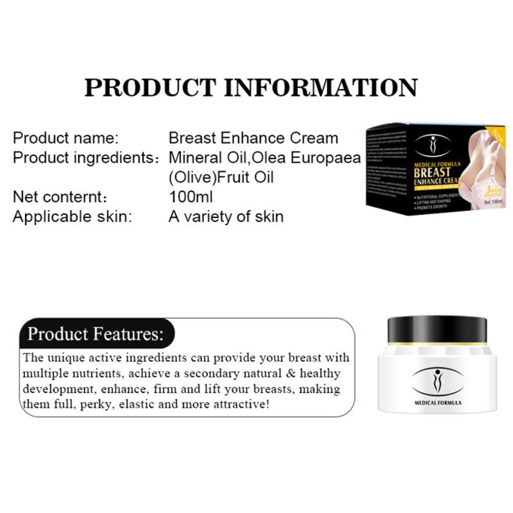 Characteristics: recovers sagging and deformation; increases blood circulation which can prevent breast lump. It can eliminate muscle tension and fatigue and improve blood circulation which can promote physical toxins that expel and prevent the accumulation of fat. Very effective breast enhancement cream that will lift the breasts, tighten the skin, eradicate black lines and eliminate cellulite. Storage: Store in a cool and dry place, keep out of the reach of children. Warning: not suitable for lactating women. Consult your doctor if you have any breast or skin conditions. Use: Apply breast cream and massage for 5 minutes twice a day, morning and night. Usually taking peanut butter size amount is best. How to use: Step 1: Spread the cream around the breasts, but avoid contact with the nipples. Step 2: Bend your body slightly, cover the base of the chest with both hands and push 10 times each. Step 3: Push the breasts out of the armpit to split 10 times each. Step 4: Pull the chest ligament several times with the middle finger and the ring finger. Specifications: Net content: 3.4 fl oz. Color: as the picture shows. Ingredients: mineral oil, fruit oil, etc. Features: Unique active ingredients can provide your breast with multiple nutrients, achieve secondary healthy and natural development, enhance, firm and lift your breasts, making them full, perky, elastic and more attractive. Quantity: 1 bottle. Note: Transition: 0.4 in = 0.394 in = 0.39 in. Without retail package. There may be a 1 to 1.2 inch margin of error due to manual measurement. Please make sure you don’t mind before you buy. Due to the difference between different monitors, the picture may not reflect the actual color of the item. Thanks! Package includes: 1 bottle of breast enlargement cream (other accessories demo in the picture are not included). High quality product. 2. Give you breast tight: active maternal cells, awaken the breast to grow, make the breast firmer and more elastic. 3. Recover sagging and deformation; increases blood circulation. Give you tight breast: active maternal cells, wake up the breast grow, make the breast firmer and more elastic. 3. Recover sagging and deformation; increases blood circulation. Give you tight breast: active maternal cells, wake up the breast grow, make the breast firmer and more elastic. 3. Recover sagging and deformation; increases blood circulation.